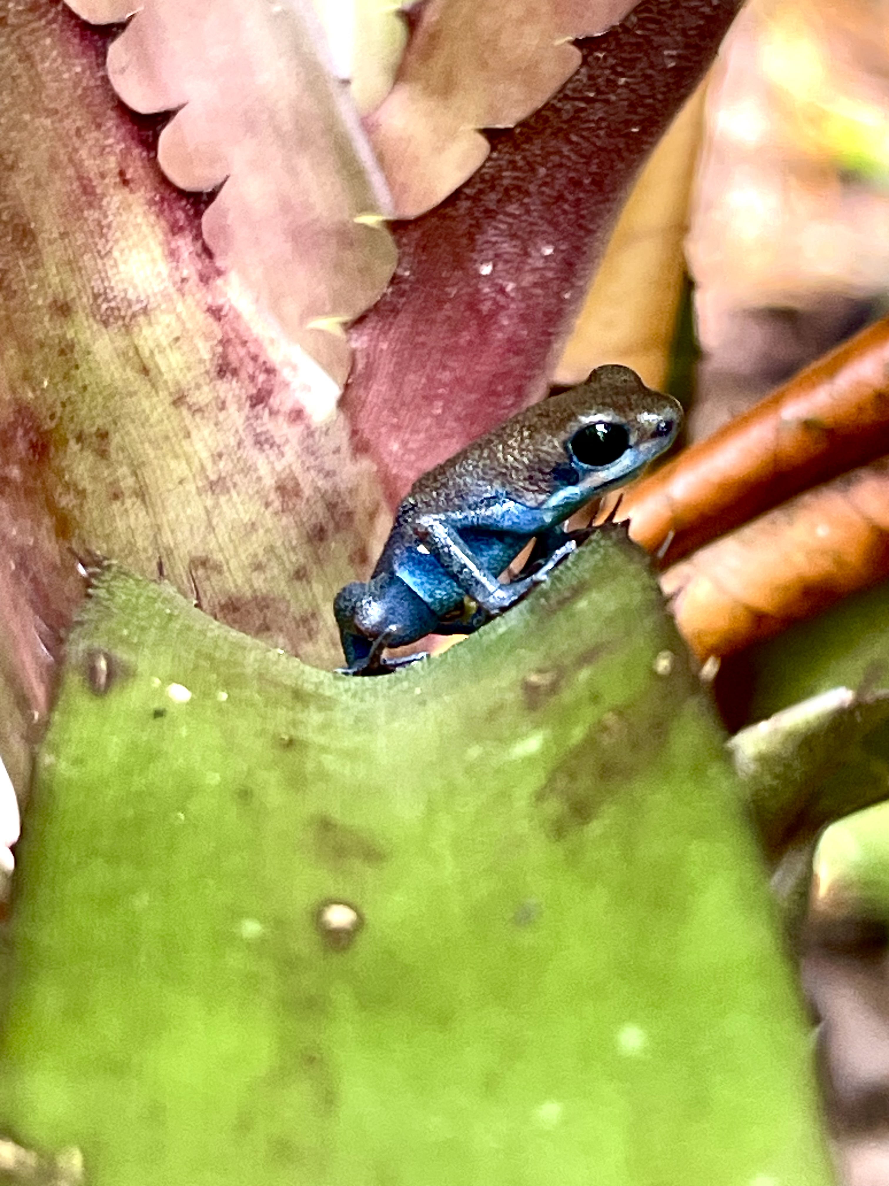 What a little piece of artwork. Hardly bigger than my thumb (which happens to be quite small) this poison-dart frog perched on a colorful bromeliad as if it knew just how beautifully contrasting such a spot would make. These frogs come in a rainbow of colors that I love to share with guests along my archipelago-wide ecotours. Each nook and cranny around the archipelago displays its own unique color combination of the highly morphological Oophaga pumilio. Read more about these beautiful little critters in my article in the local Bocas Breeze Newspaper and feel free to contact me for more of an idea of this magical collection we are so fortunate to have, only here, in the richly biodiverse province of Bocas del Toro.